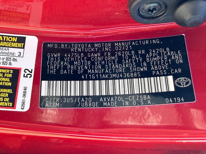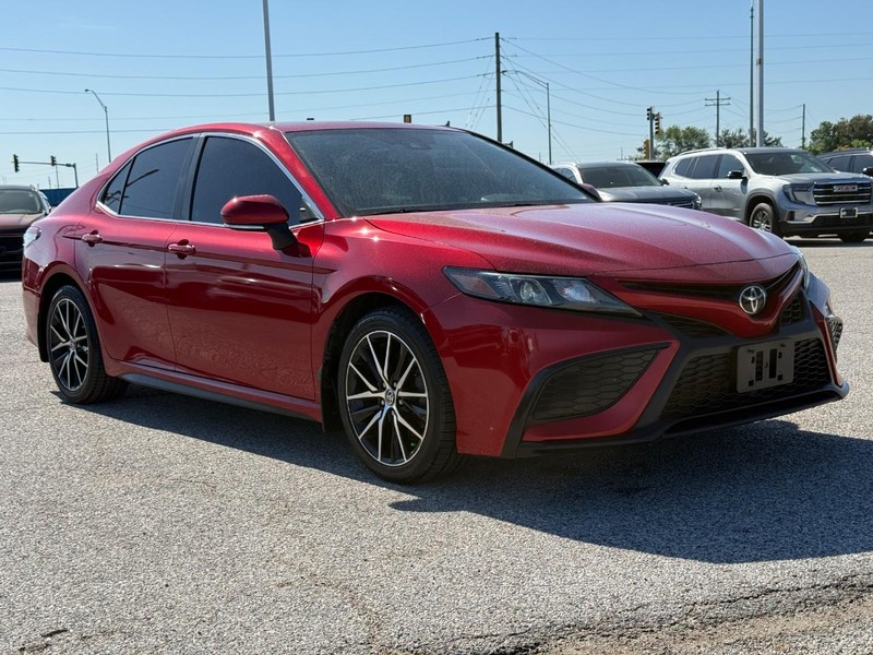 Recent Arrival! Red Toyota Camry A MUST SEE!! ** 4-Wheel Disc Brakes **, ** 6 Speakers **, ** ABS brakes **, ** Air Conditioning **, ** All-Weather Floor Liner Package (TMS) **, ** Alloy wheels **, ** AM/FM radio: SiriusXM **, ** Apple CarPlay/Android Auto **, ** Auto High-beam Headlights **, ** Automatic temperature control **, ** Black Out Badges (TMS) **, ** Blackout Package (TMS) **, ** Blind Spot Monitor w/Rear Cross Traffic Alert **, ** Brake assist **, ** Bumpers: body-color **, ** Delay-off headlights **, ** Driver door bin **, ** Driver vanity mirror **, ** Dual front impact airbags **, ** Dual front side impact airbags **, ** Electronic Stability Control **, ** Emergency communication system: Safety Connect with 1-year trial **, ** Exterior Parking Camera Rear **, ** Fabric Seat Trim w/Sport SofTex **, ** Four wheel independent suspension **, ** Front anti-roll bar **, ** Front Bucket Seats **, ** Front Center Armrest **, ** Front reading lights **, ** Fully automatic headlights **, ** Heated Exterior Mirrors w/Turn Signal Indicators **, ** Illuminated entry **, ** Knee airbag **, ** Low tire pressure warning **, ** Mudguards (TMS) **, ** Occupant sensing airbag **, ** Outside temperature display **, ** Overhead airbag **, ** Overhead console **, ** Panic alarm **, ** Passenger door bin **, ** Passenger vanity mirror **, ** Power door mirrors **, ** Power driver seat **, ** Power steering **, ** Power Tilt/Sliding Moonroof **, ** Power windows **, ** Radio data system **, ** Radio: AM/FM Audio System **, ** Rear anti-roll bar **, ** Rear Bumper Applique (Black) (TMS) **, ** Rear seat center armrest **, ** Rear side impact airbag **, ** Rear window defroster **, ** Remote keyless entry **, ** Rocker Applique (TMS) **, ** Security system **, ** Speed control **, ** Speed-sensing steering **, ** Split folding rear seat **, ** Spoiler **, ** Steering wheel mounted audio controls **, ** Tachometer **, ** Telescoping steering wheel **, ** Tilt steering wheel **, ** Traction control **, ** Trip computer **, ** Variably intermittent wipers **, ** Wheels: 8.0J x 18" Black Machined-Finish Alloy **.